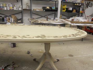 1. this table was sent to me 2. sanded, stripped , and faux grained 3. border design sketch 4. refined for stencil 5. cut stencil